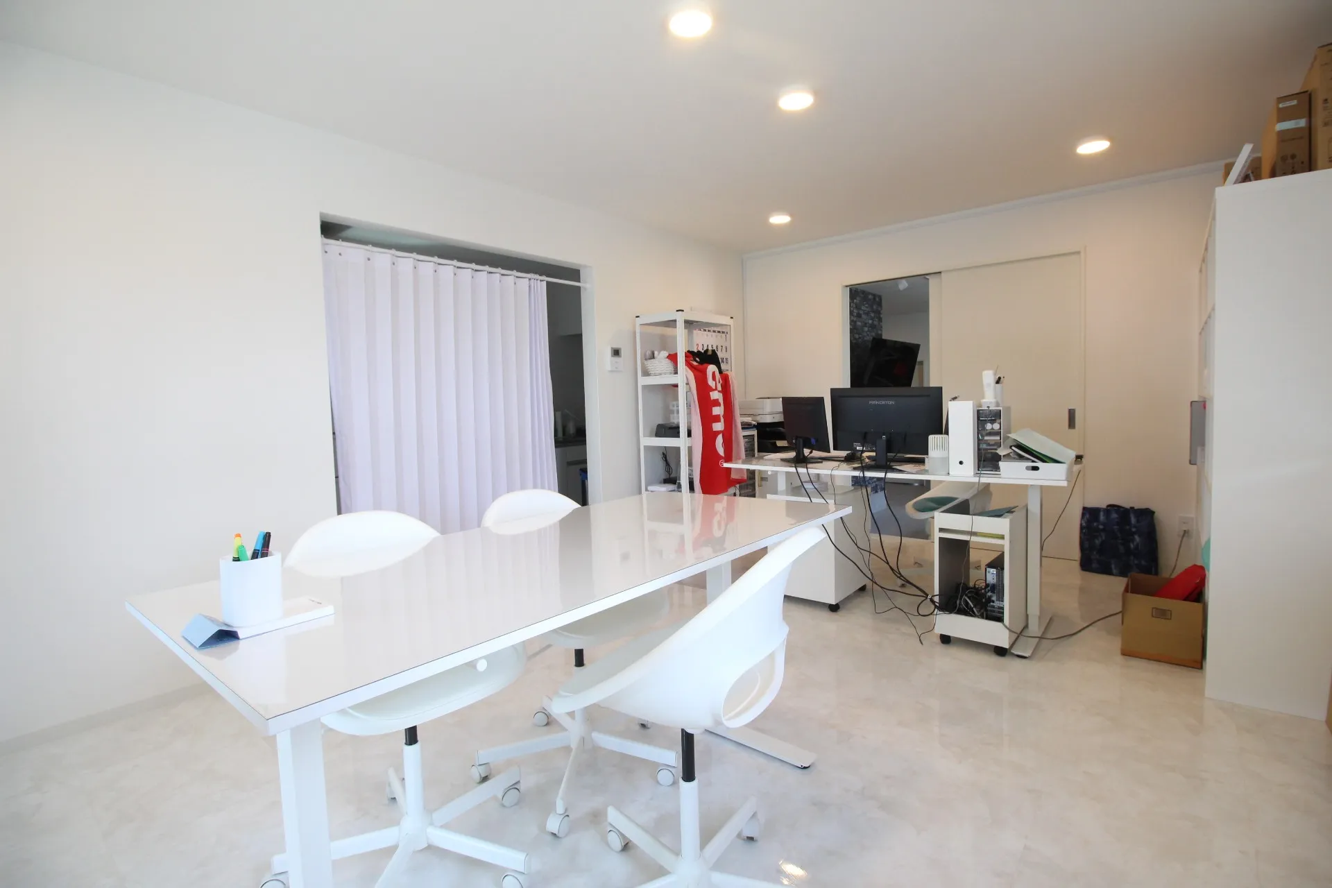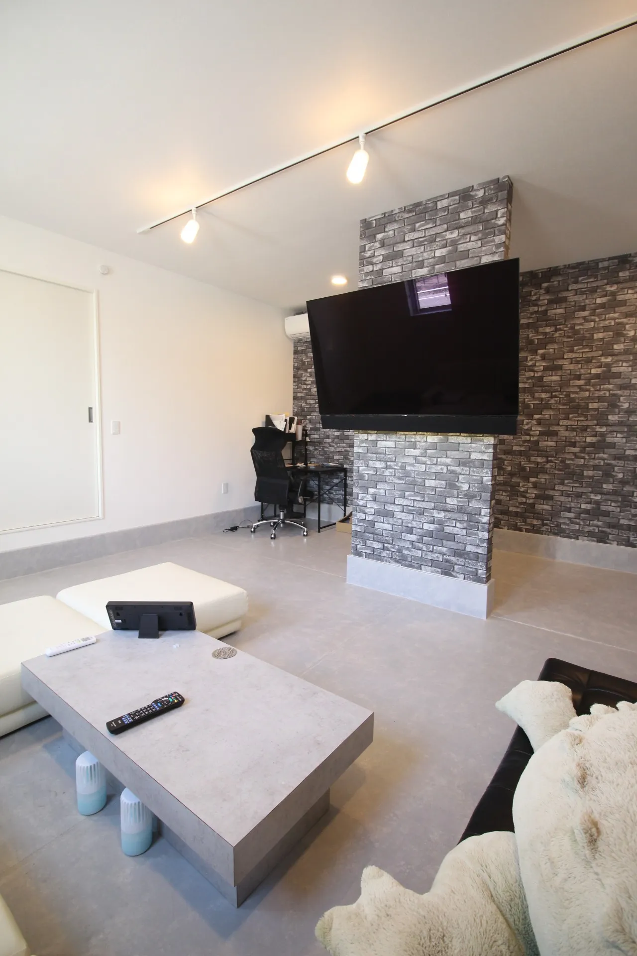 洗練された外観と、インダストリアルな雰囲気を感じる内装が調和する事務所兼用住宅。事務所と住宅の一部には土間床仕上げを採用し、土足で利用できる実用的な仕様に。仕事とプライベートを自然に切り替えられる住まいです。