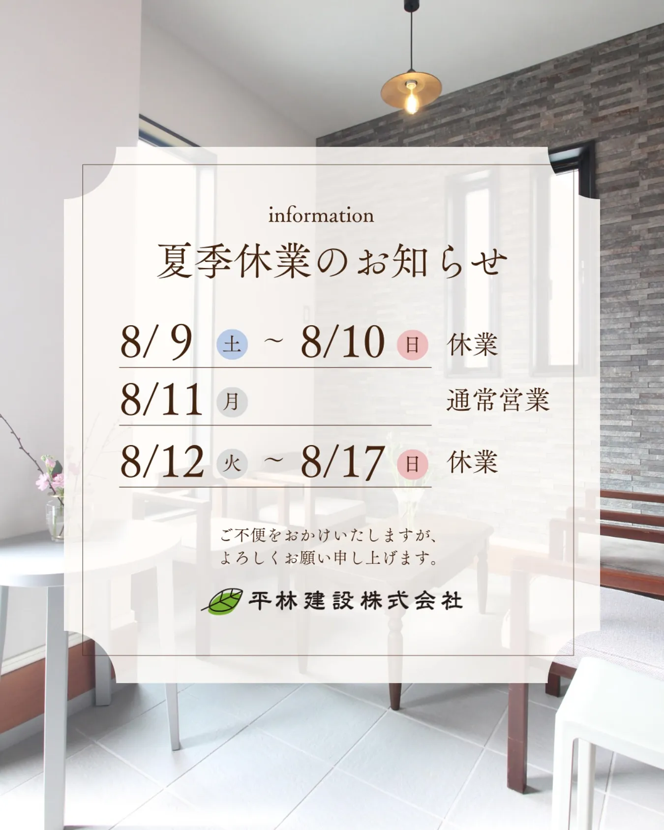 8月12日- 8月17日を夏季休業とさせていただきます。